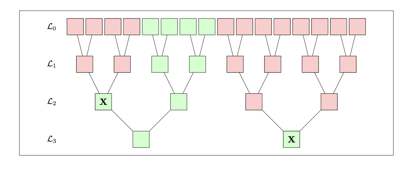 Once we've considered all groups of three, we can assign colors. All paths that start from a leaf in layer $0$ and terminate with an $\mathbf{X}$ are marked red (excluding the $\mathbf{X}$). We do this to reflect the fact that starting from such leaves, the verifier will inevitably arrive to the $\mathbf{X}$ and notice the inconsistency. All other nodes are colored green. An example is given below.